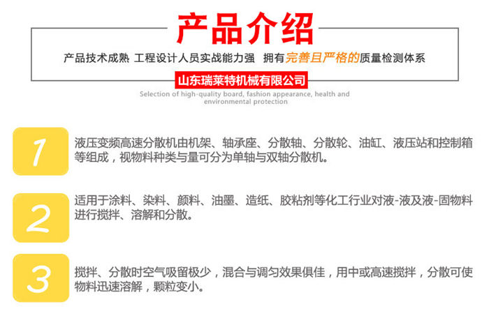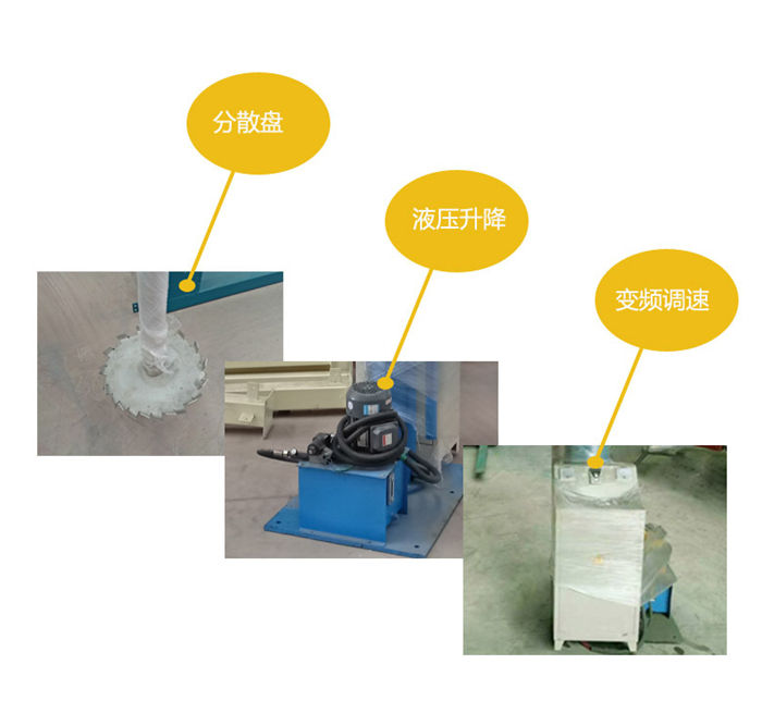 該設備采用變頻防爆分散機,高速分散的用途是把極細微的固體粒子加入液體中,做成懸浮粒子,懸浮粒子的特性是微細粒子不受地心引力而沉淀;機架升降采用液壓傳動,升降平穩可靠,機架可以回轉360度,能一機多缸使用。